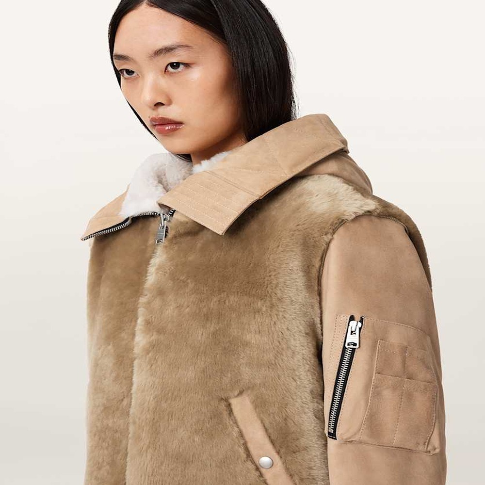 Practicality remains a key focus: generous front pockets provide secure storage for essentials or hand‑warming, while the heavy shearling lining keeps body heat locked in. The combination of leather exterior and shearling interior ensures that this jacket doesn’t just look good — it performs. Over time, the leather shell will soften and mould slightly to your body shape, while the shearling retains its insulating properties, making it a long‑lasting winter companion rather than a seasonal fad.